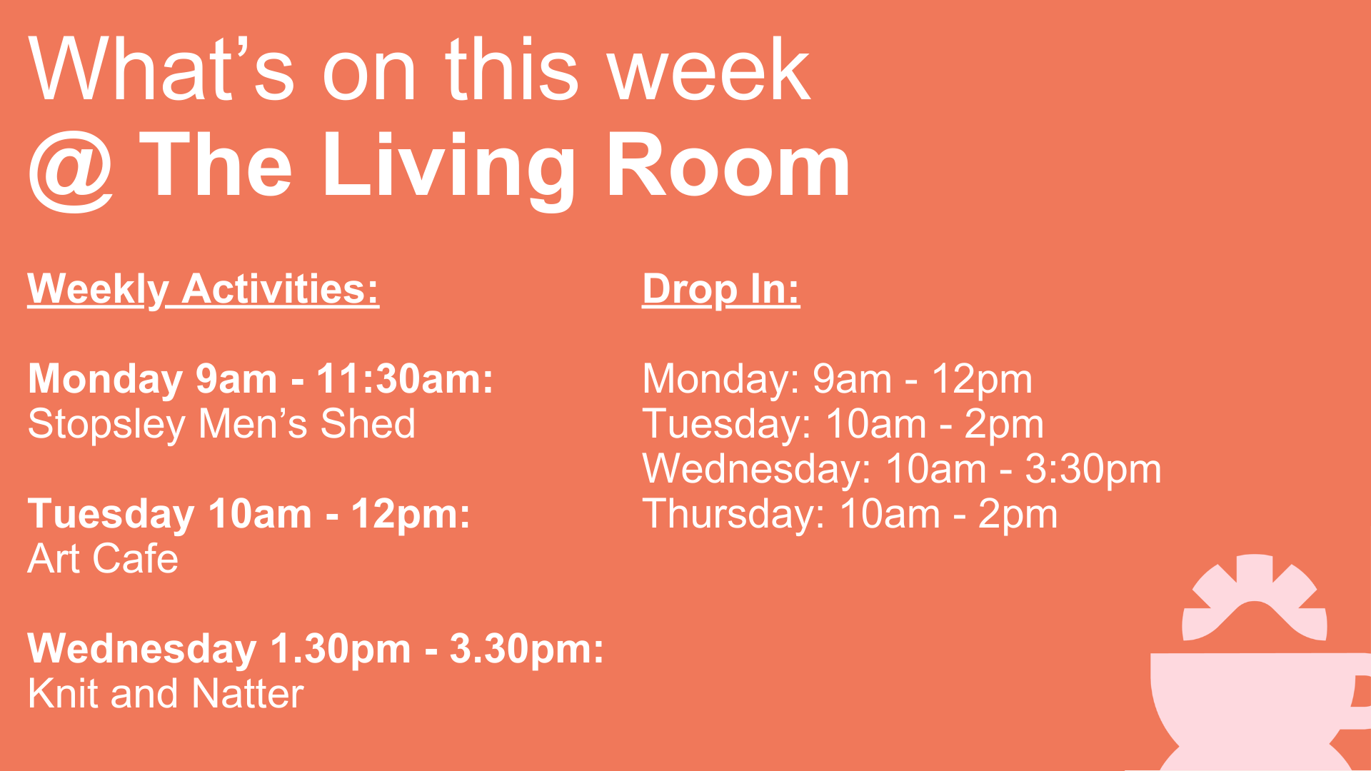 The Living Room has new opening hours. Come by and make yourself at home. You can relax and chat with others, or just sit back and read. How you spend your time here is up to you. Everyone is welcome!